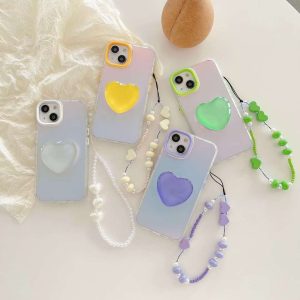 ハート型グリップ付きiphone13series 対応ケース 韓国 女子 iphone12/11用 クリアケース チェーン 可愛い