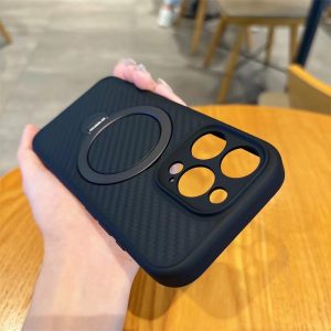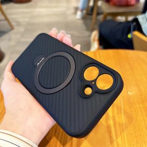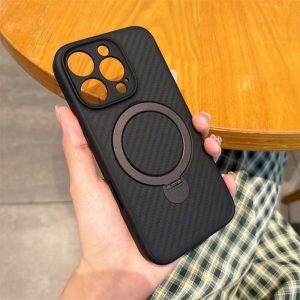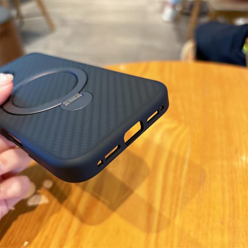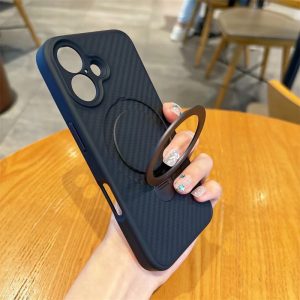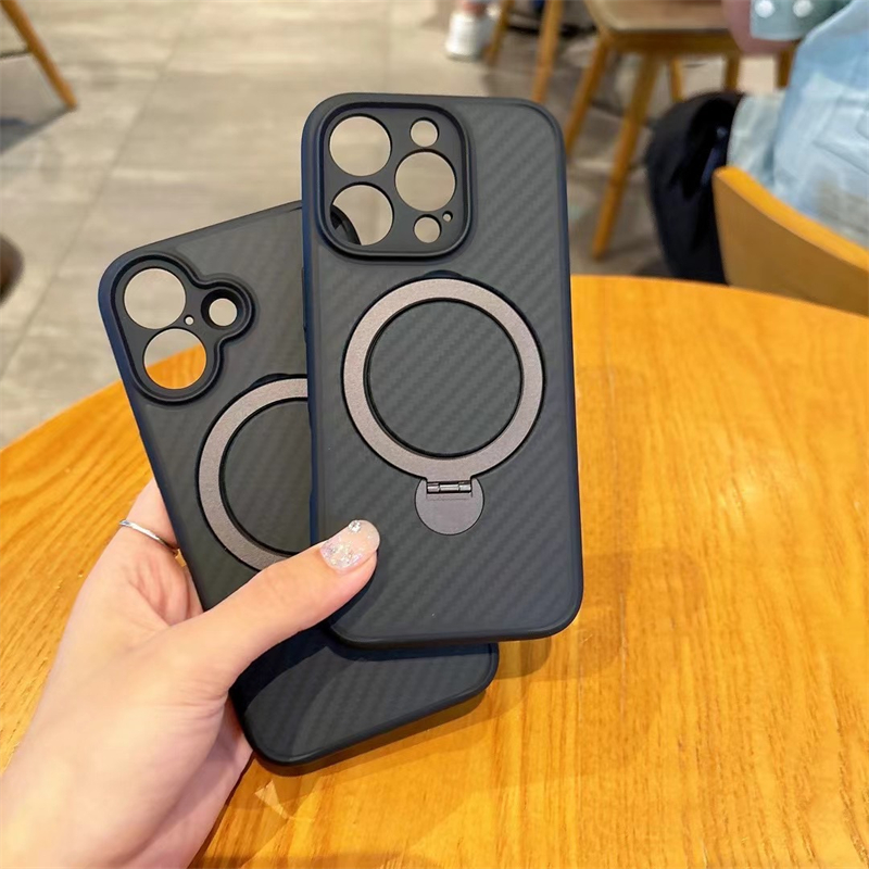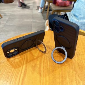 背面にスタンド付きのiPhone16シリーズケース。金属調のリングは見た目の一体感や高級感もアップ。