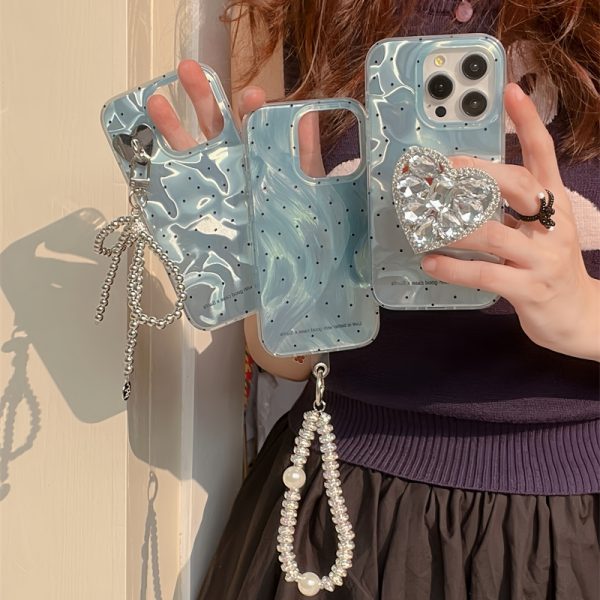 水のウェーブデザインにドット柄をあしらったiPhoneケース。光の角度によってオーロラのように煌めいて美しく見えます。3種類があり、それぞれストラップ、ハード型ホルダー、リボンチャームが付いており、どれでもかわいくて若い女性に好まれている。お好きにお選びください♪