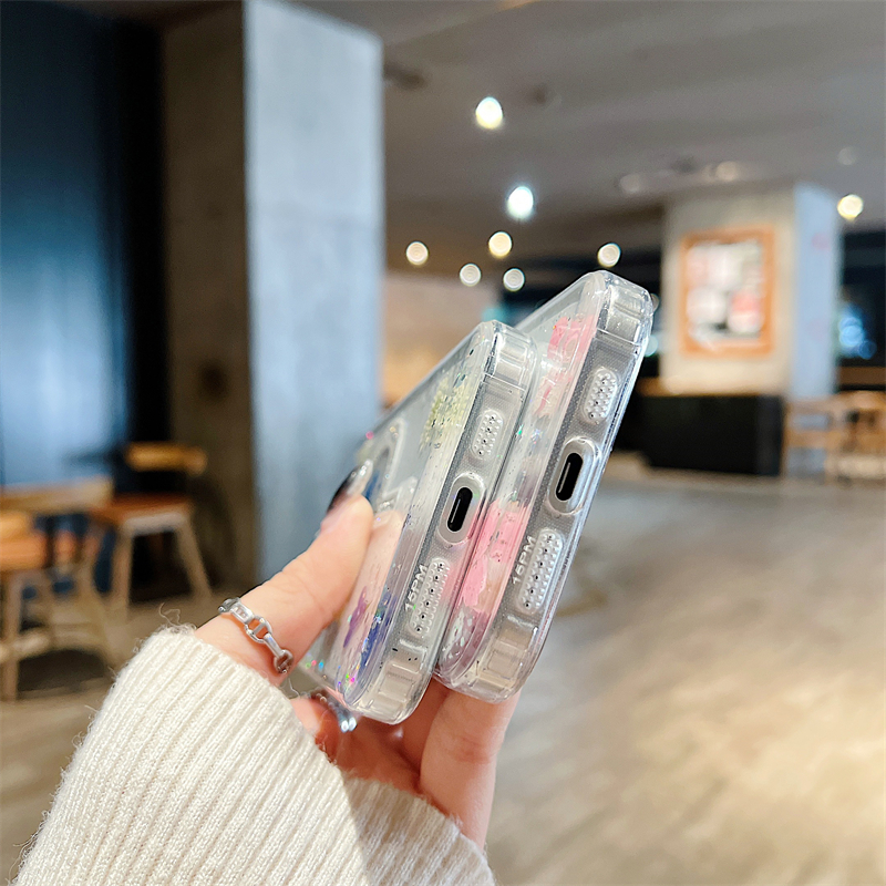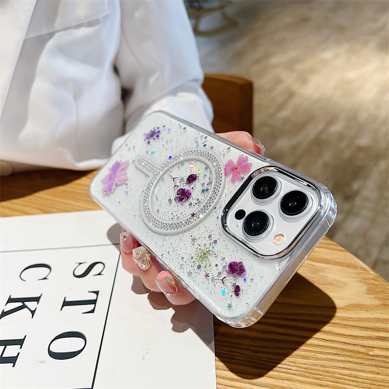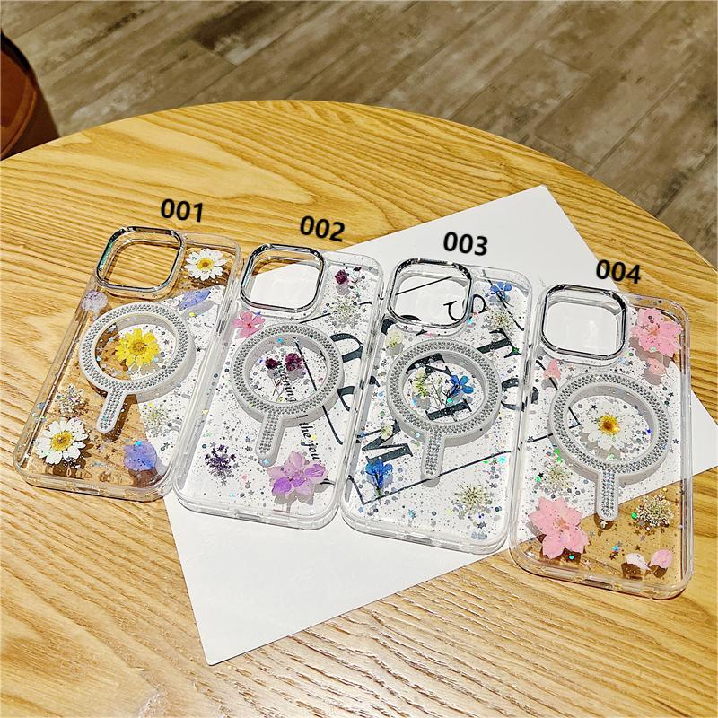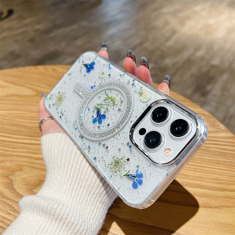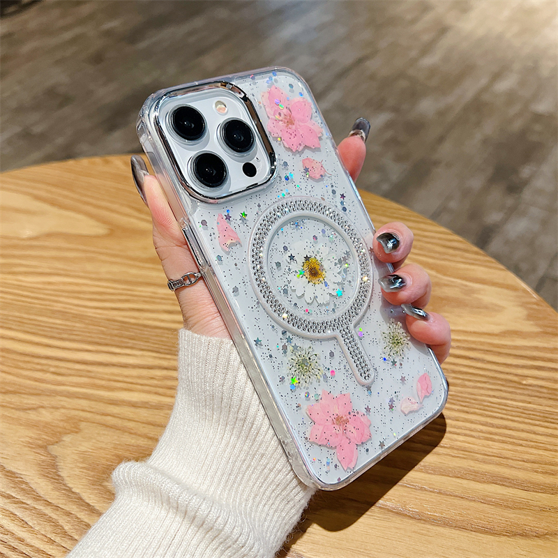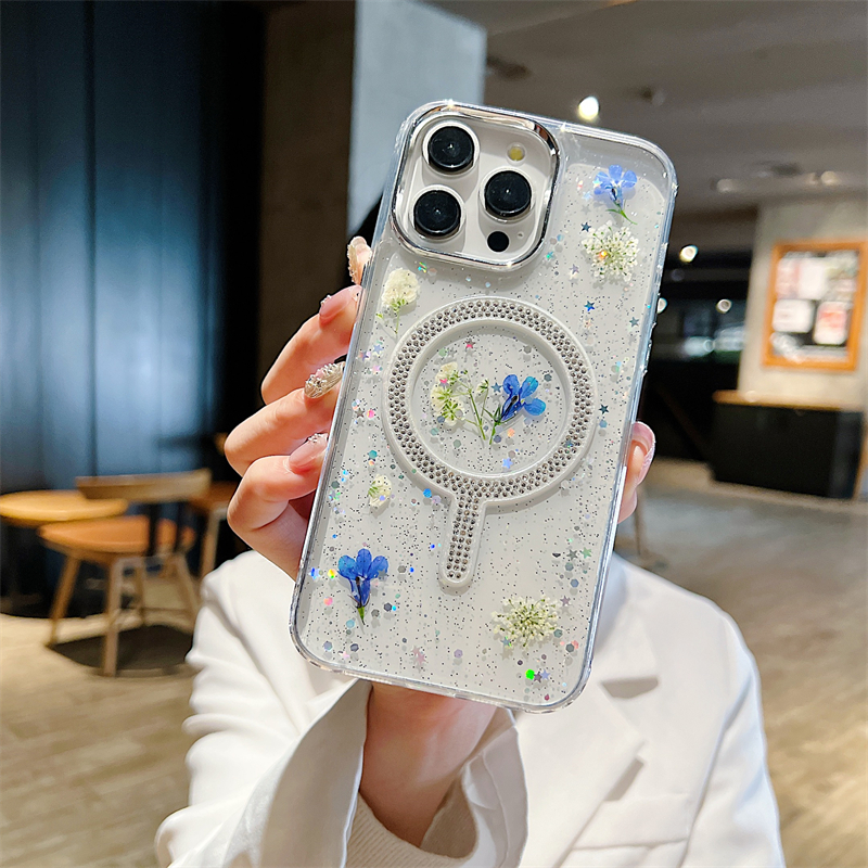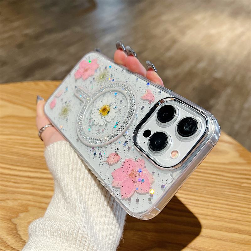 押し花加工された本物の花を使用したおしゃれな韓国風iPhoneケース!ケース一つずつに独特な魅力があります。magsafe対応できるのも一つのポイントです。またクリアケースにキラキラなグリッターが入っており、スマホの本来の色を楽しみながら、さらに可愛く見えます!