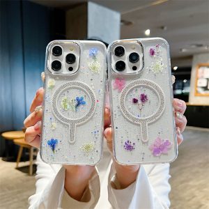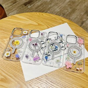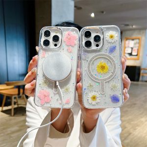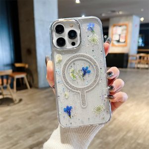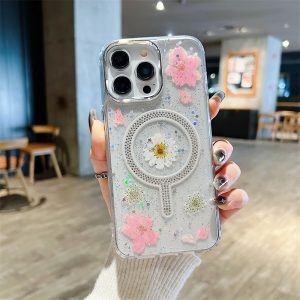 押し花加工された本物の花を使用したおしゃれな韓国風iPhoneケース!ケース一つずつに独特な魅力があります。magsafe対応できるのも一つのポイントです。またクリアケースにキラキラなグリッターが入っており、スマホの本来の色を楽しみながら、さらに可愛く見えます!