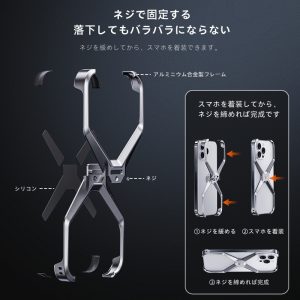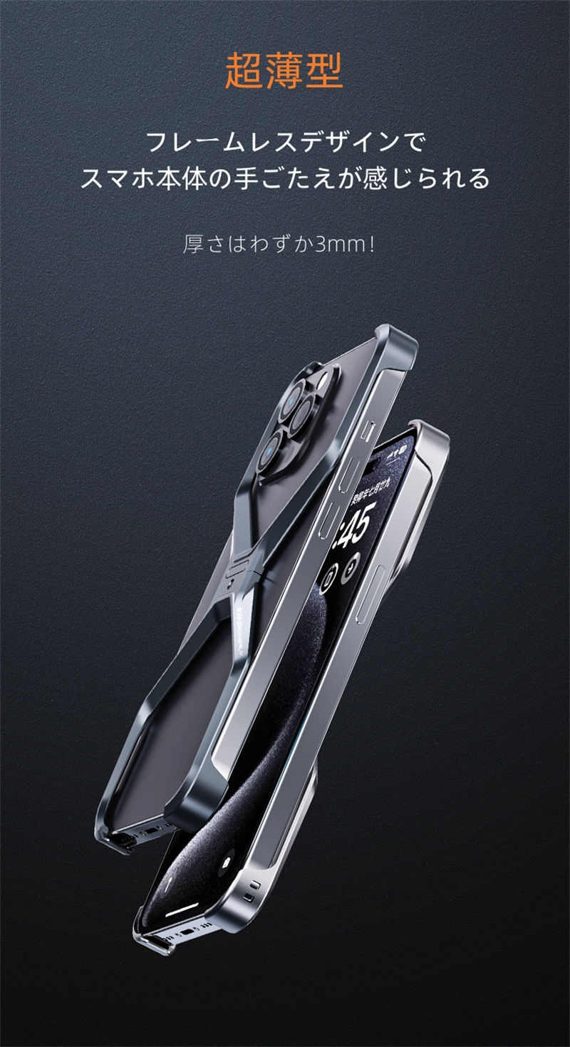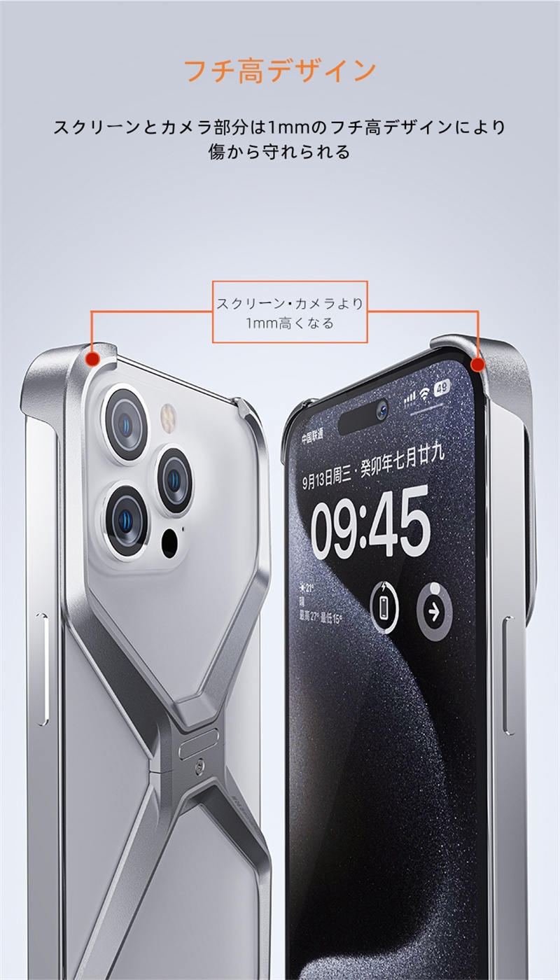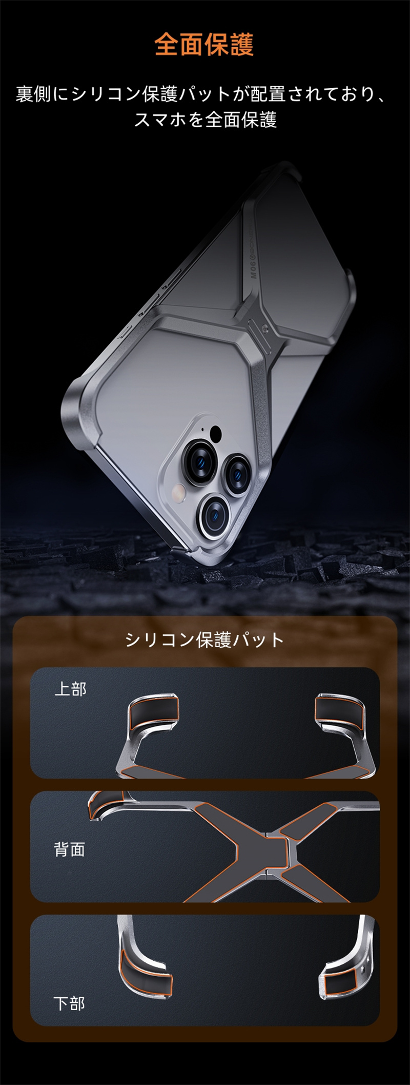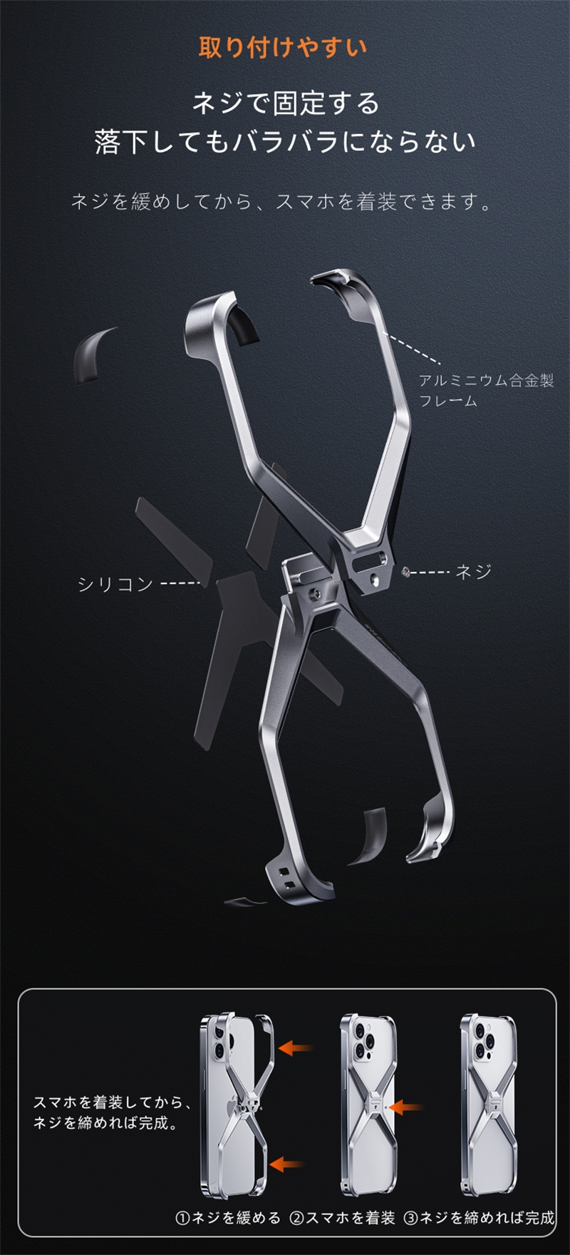 アルミニウム合金製のiPhoneケースです!フレームレスデザインは放熱性に優れている! アルミニウム合金製は超軽くて、持ちやすい! ネジで固定する!スマホを着装してからネジを締めれば固定できます!落ちてもバラバラにならない! 裏側にシリコン製保護パットが配置されており、スマホを全面保護!