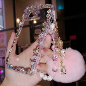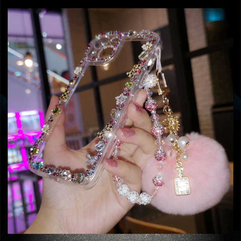 カラフルなラインストーンで飾られたクリアiPhone16ケース。もこもこチャーム&ビーズストラップ付きで、ピンクの色合いは持っているだけで女子力アップ!