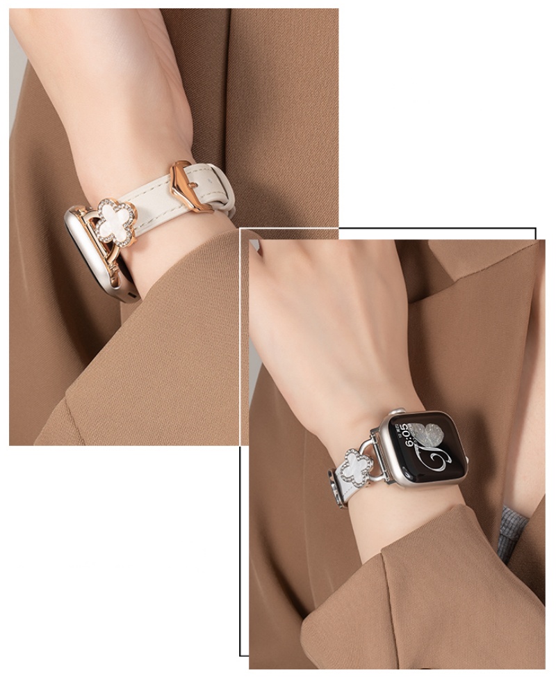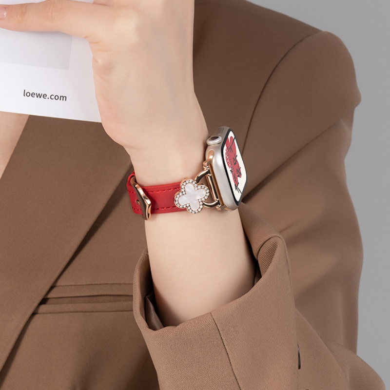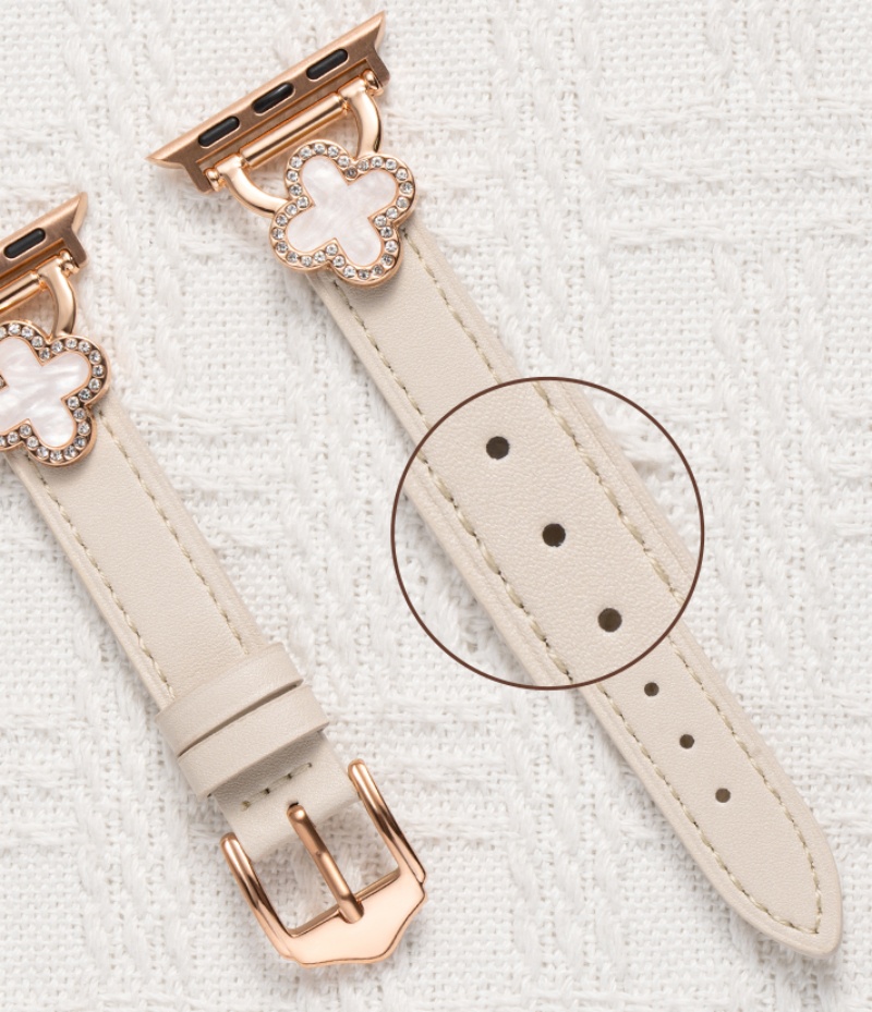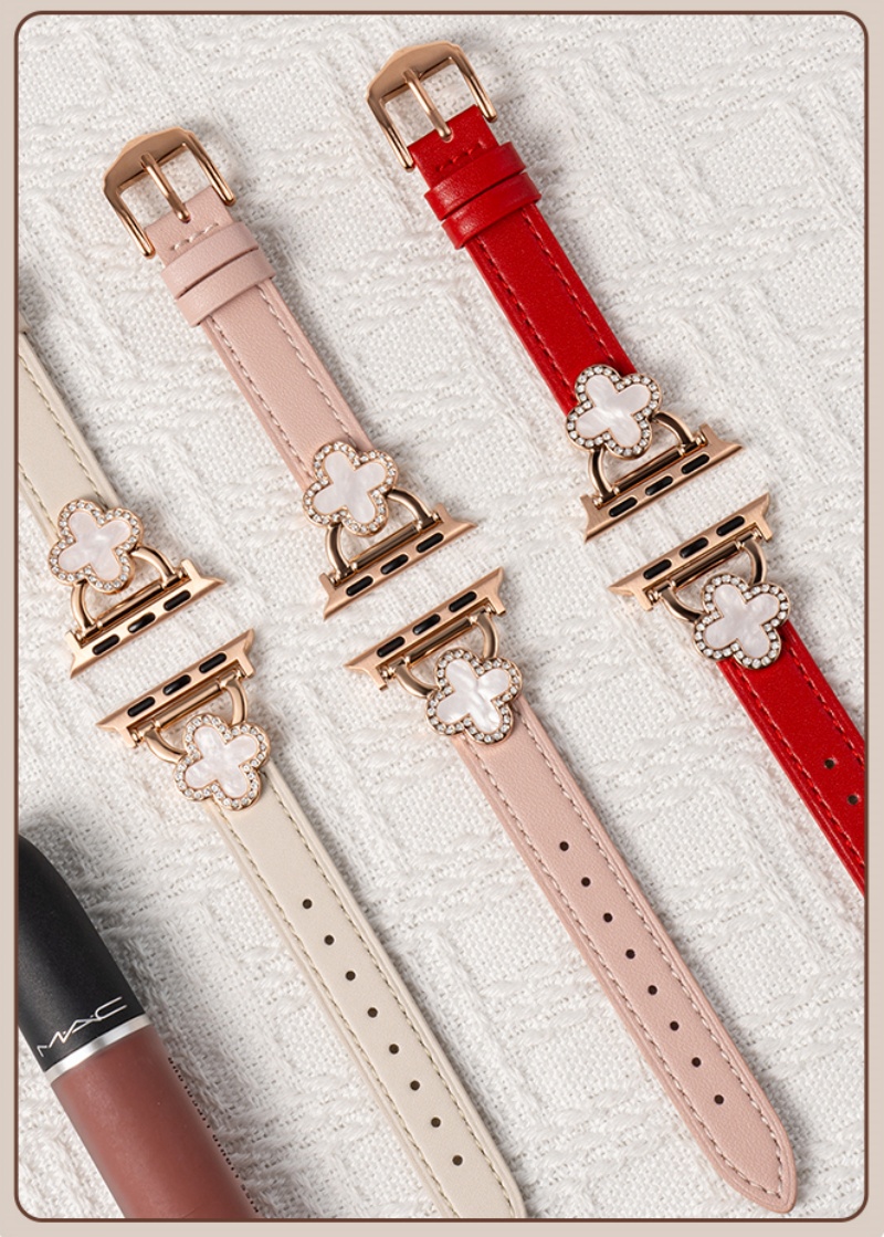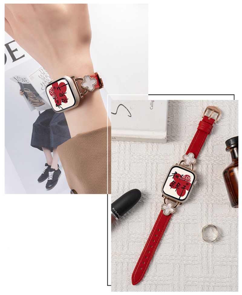 四つ葉のクローバーモチーフが可愛く見える、本革製アップルウォッチバンド。小さなラインストーンを飾り、華やかでエレガントな雰囲気を引き立てています。上質な本革素材に丁寧な縫製、耐用性に優れ、長期間お使いいただけます。全7色があります。