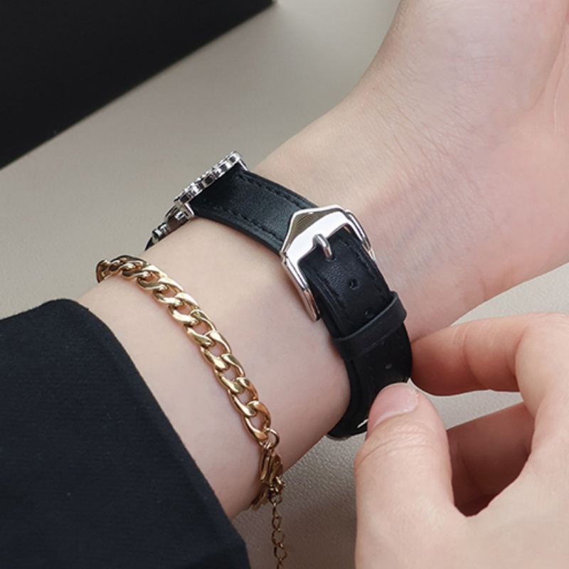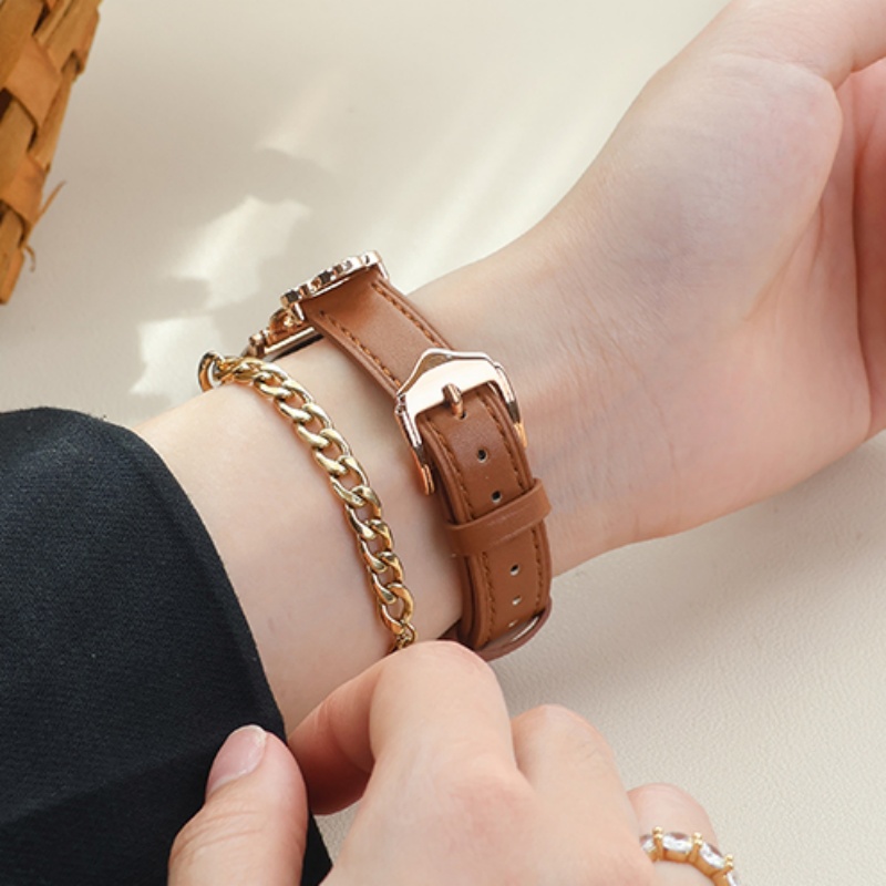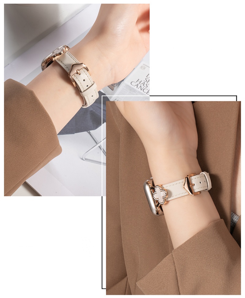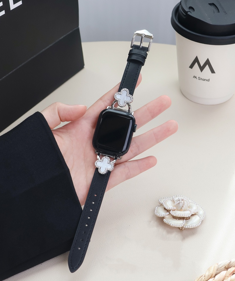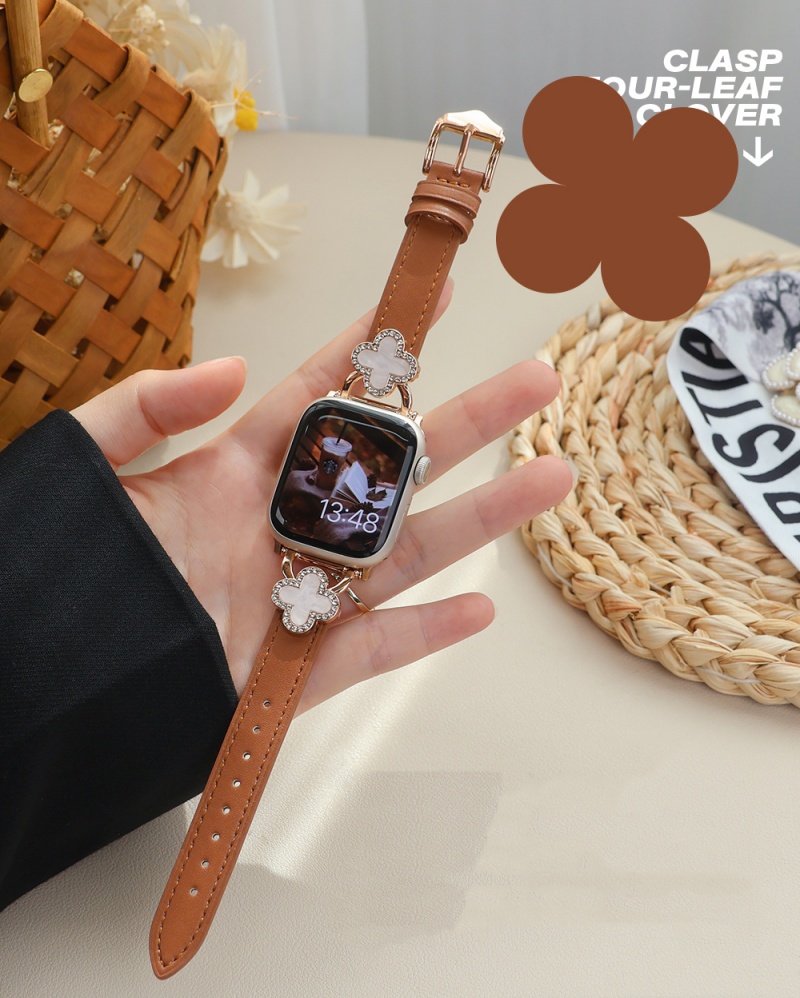 四つ葉のクローバーモチーフが可愛く見える、本革製アップルウォッチバンド。小さなラインストーンを飾り、華やかでエレガントな雰囲気を引き立てています。上質な本革素材に丁寧な縫製、耐用性に優れ、長期間お使いいただけます。全7色があります。